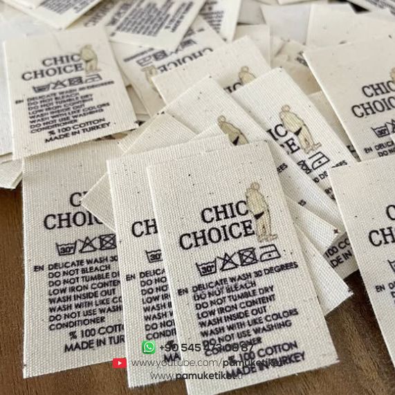 Pamuk etiket üretiminde kalite, doğru baskı teknikleri ve dayanıklı iplik seçimi ile sağlanır. Kullanılan boyalar insan sağlığına zararsız olup, uzun süreli kullanımlarda dahi solma yapmaz. Tasarım sürecinde okunabilirlik, font uyumu ve marka kimliği ön planda tutulur.